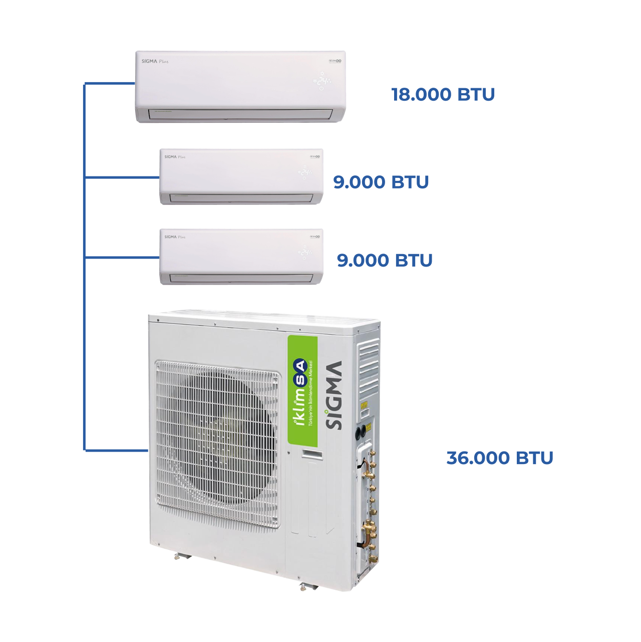 Sigma Multi Klimalar – 36000 BTU Dış Ünite + 2 x 9000 BTU + 1 x 18000 BTU İç Ünite